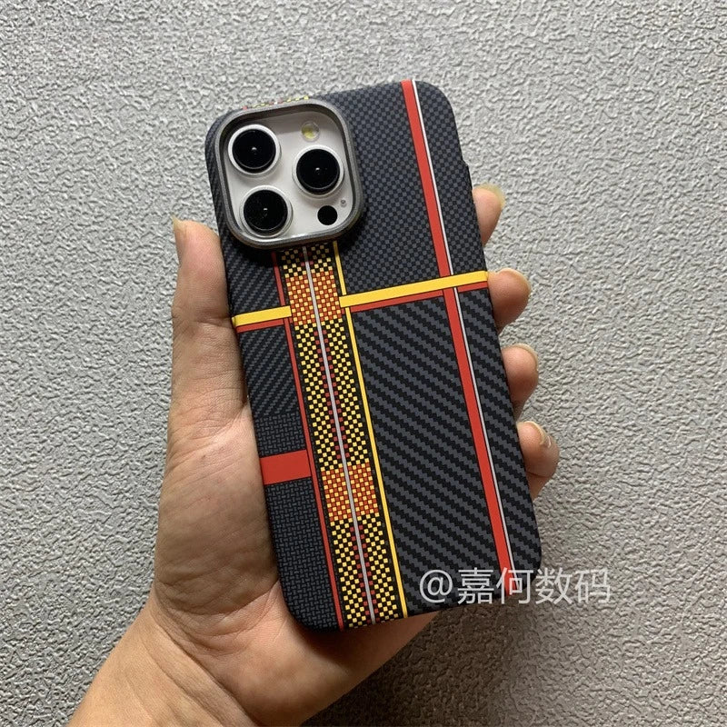 Upgrade your iPhone protection and style with this premium MagSafe-compatible case. Designed with a unique geometric color-collision pattern, carbon relief texture, and metal alloy camera protection, this case blends luxury aesthetics with rugged durability. Made from a strong PC + TPU hybrid, it offers shockproof defense, a smooth matte feel, and anti-fingerprint performance—perfect for everyday use.