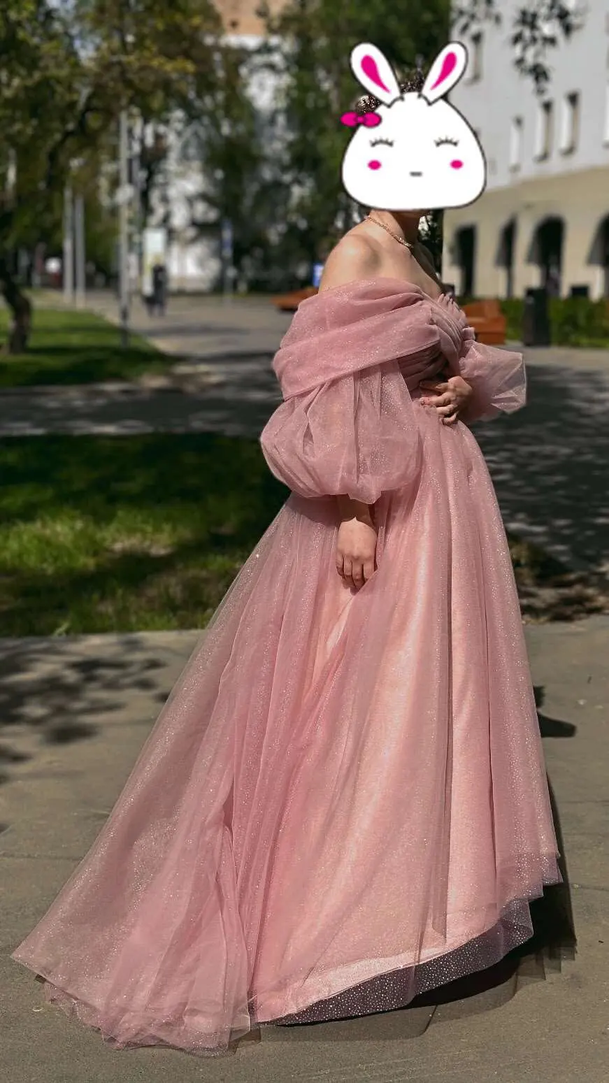 Pink Shiny Tulle Prom Dress | Off The Shoulder Long Puff Sleeve Slit Women Arabia Wedding Dress