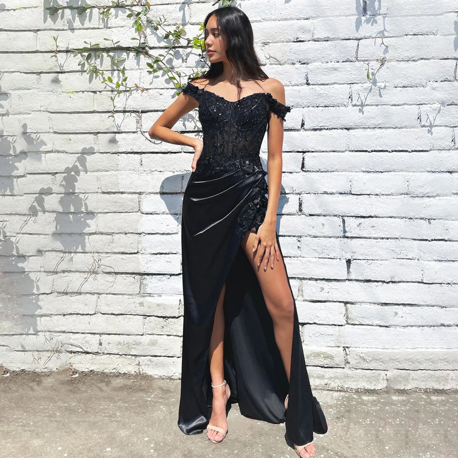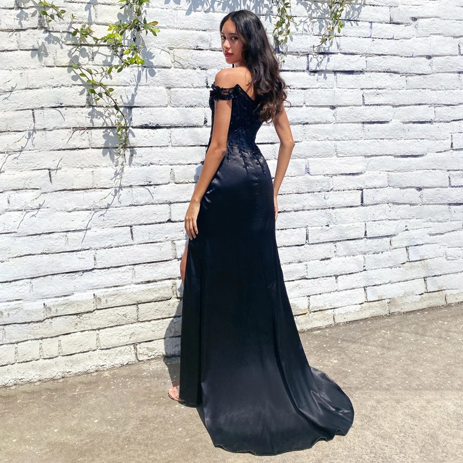 Side Leg Slit Off the Shoulder Long Floral Lace & Satin Cocktail Dress